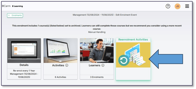To automatically re-enrol learners for each training cycle, you’ll need to set up your Re-enrolment Activities. This guide explains how to enable and customise re-enrolment, as well as how to manage course activities—whether you’re continuing with existing modules or updating them with new ones.