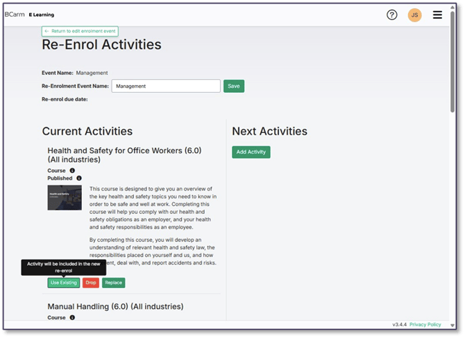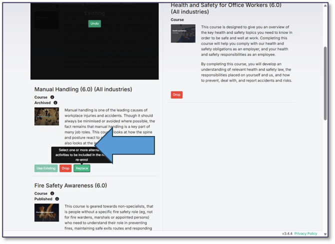 You have the option to ‘Use Existing’, ‘Drop’ or ‘Replace’ each course for the next training cycle.