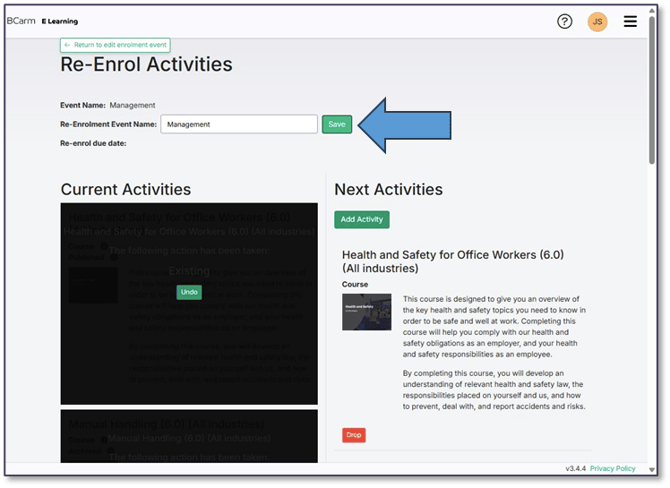 6. Once you have gone through all the Activities, click ‘Save’ at the top of the screen, then ‘Return to Edit Enrolment Event’.